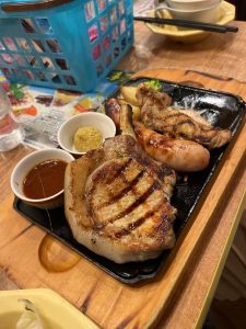 骨付きポーク、大きなソーセージとグリルチキンのセットでBBQソースと粒マスタードつき。、