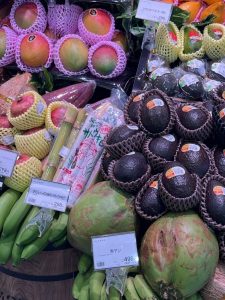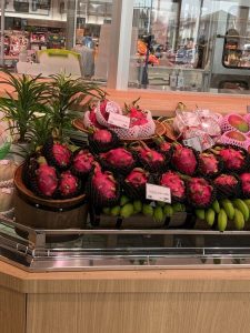 入ってすぐの場所にあるフルーツコーナーはドラゴンフルーツやココナッツなどちょっと珍しいフルーツがたくさん並んでいました、。アボカドもおおきい!