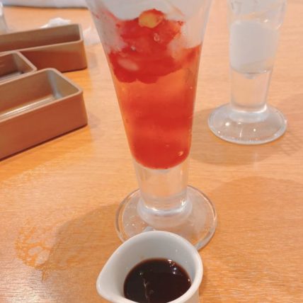 黒蜜がついてるパフェ。モンブランの風味がの濃厚だし、下はストロベリーの酸味がいいパンチになっているし、