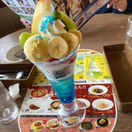 りんご、シャインマスカット、キウイが上にのっているサンデーで、下はブルーハワイ味の天然水ゼリー。後味さっぱりで美味しいサンデーでしたね。