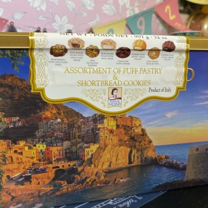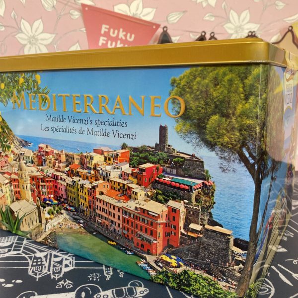 お薬箱かよ?ってくらいのでっかい四角型のクッキー缶!そこにプリントされているのはイタリアの世界遺産「チンクエテッレ(5つの村)」です。