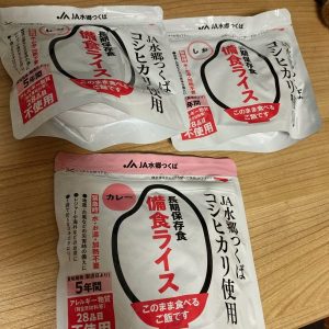 食料は3食分。JA水郷つくばの備食ライスが3食はいってました。