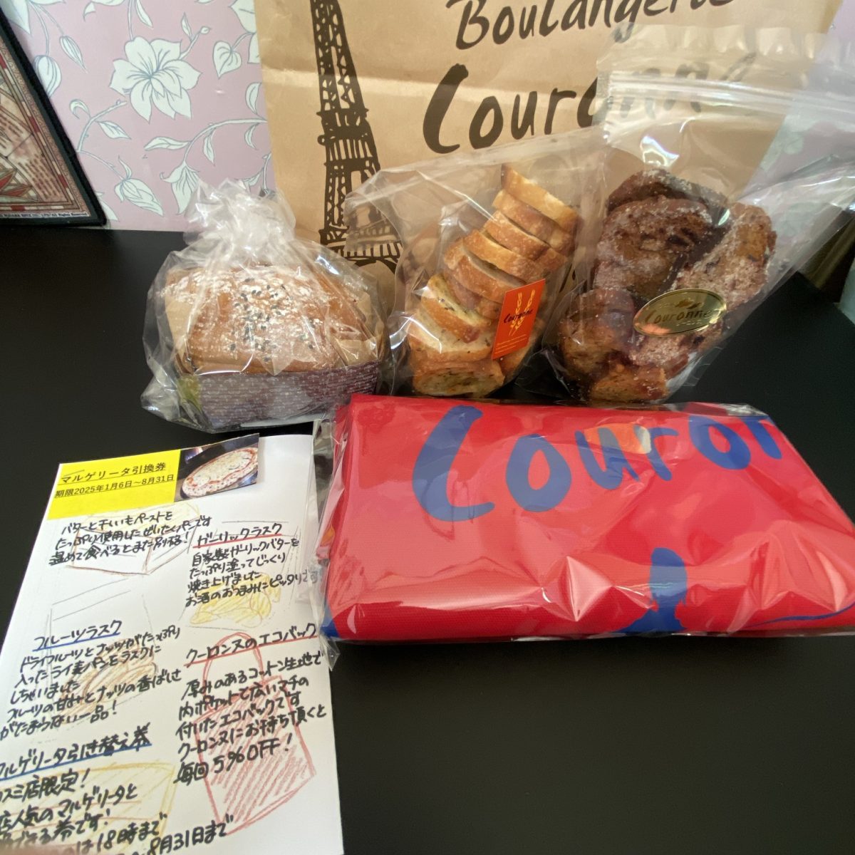 クーロンヌ福袋2025は 2160円でピザマルゲリータ引換券やエコバッグが入ってました。
