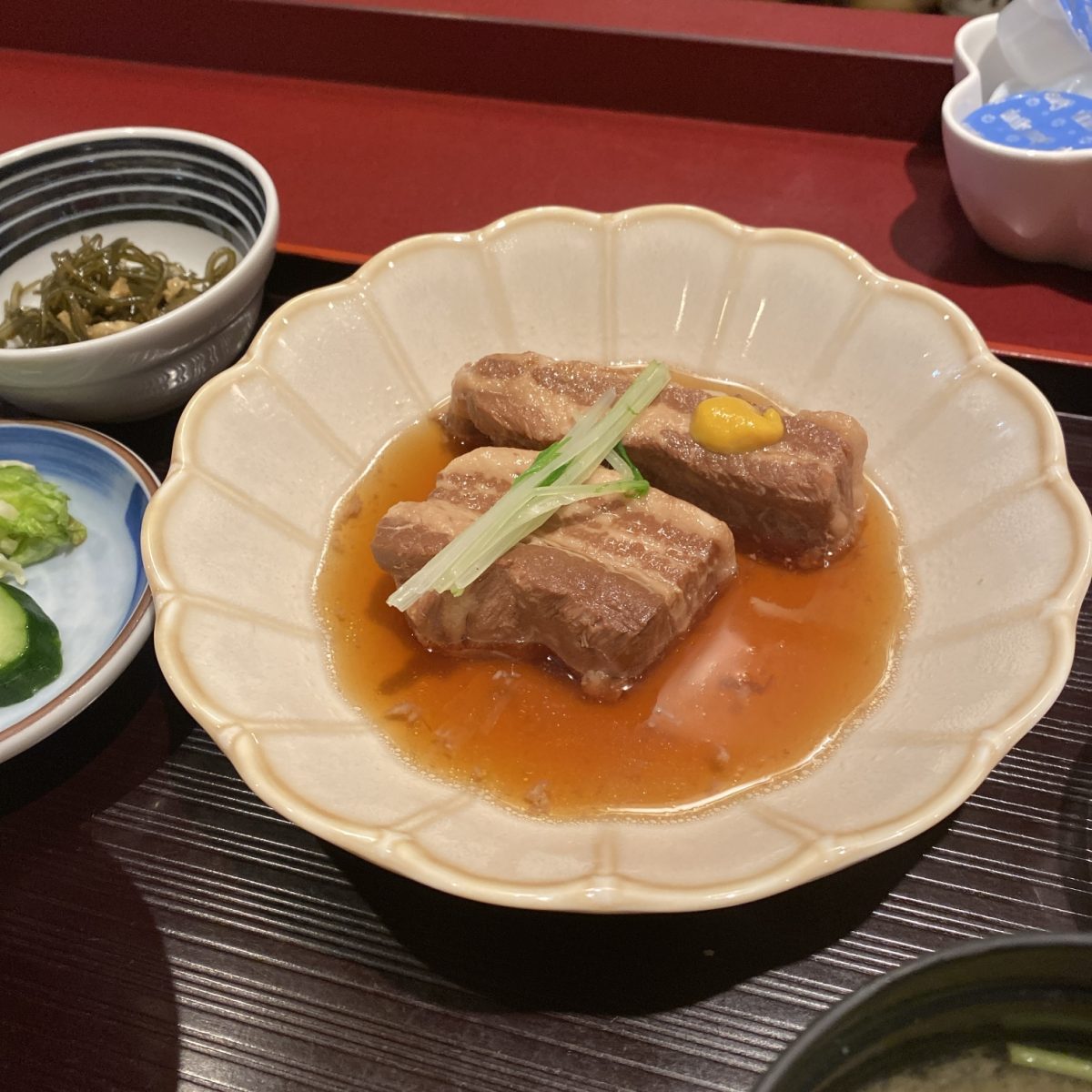 箸をいれたら崩れるほど甘く、口にいれたら溶けていくやわらか豚の角煮は美味でした(つまんだ)味は優しい味。