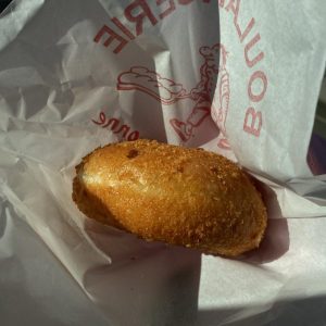 ピリリとからいクーロンヌのカレーパン。パン生地の外側はカリカリ、生地の内側がもっちもちで少し甘いのが特徴。ほんのり甘い生地だから、カレーの辛さが引き立ちます。