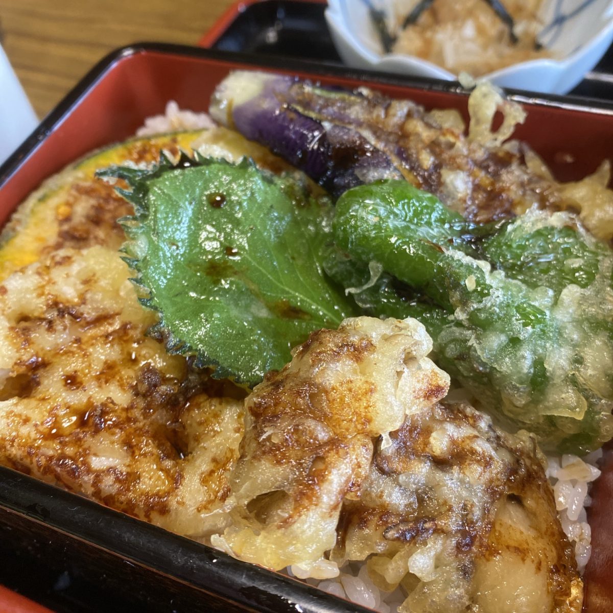 しっとり系の野菜天丼ですが、たれにくぐらせている系ではなくかけているタイプですかね