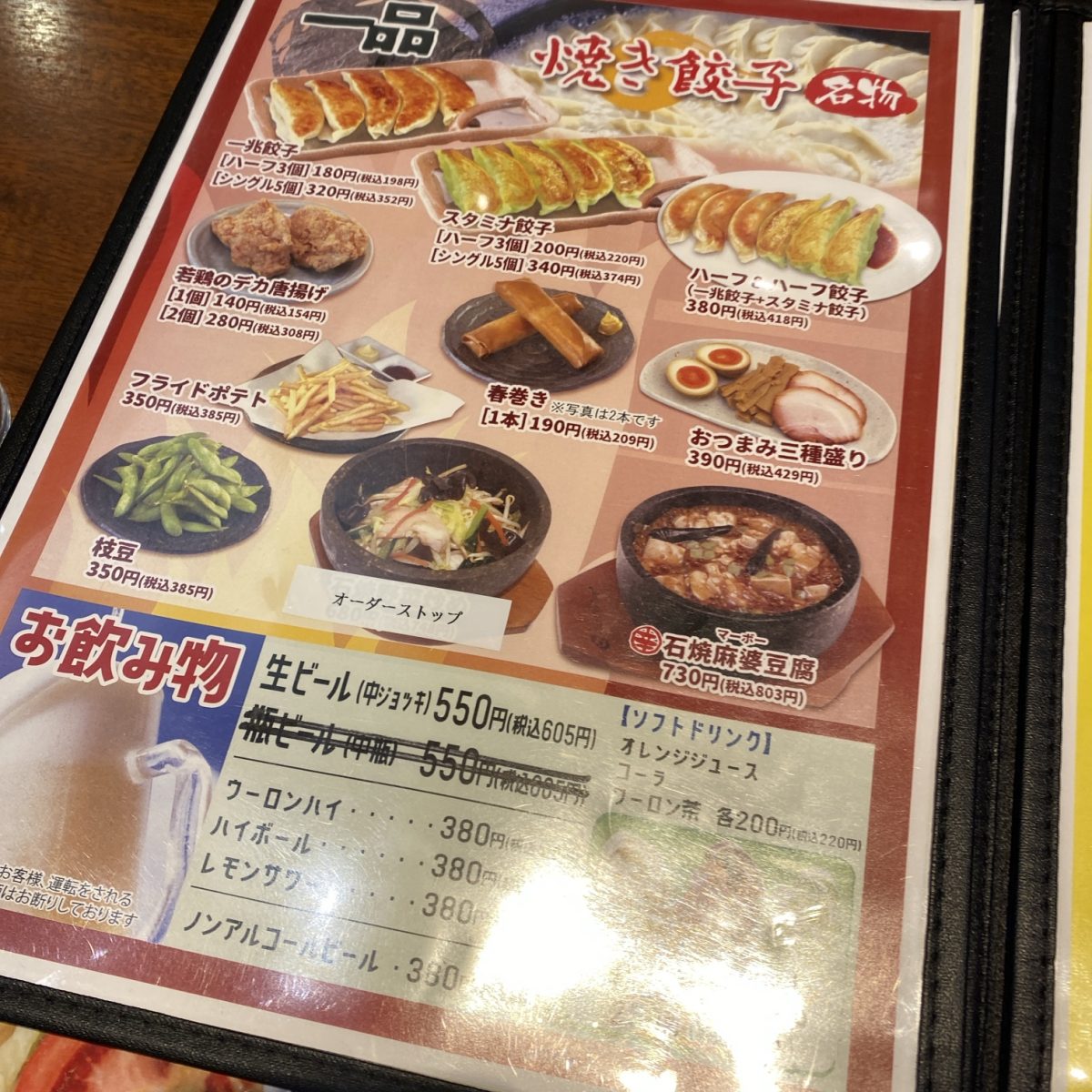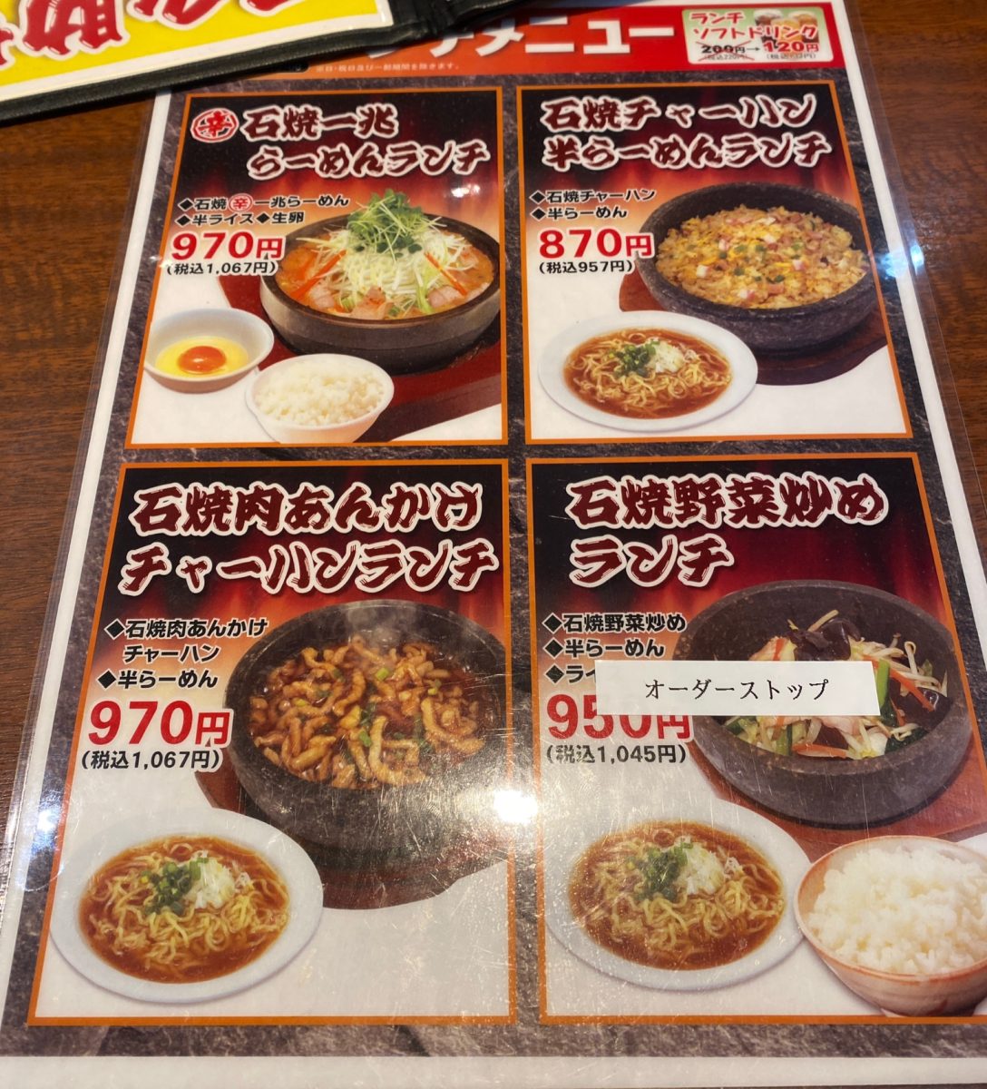 爆裂石焼らーめん一兆のメニューは石焼ラーメン系、石焼チャーハン、ノーマルラーメンや一品料理などでした。