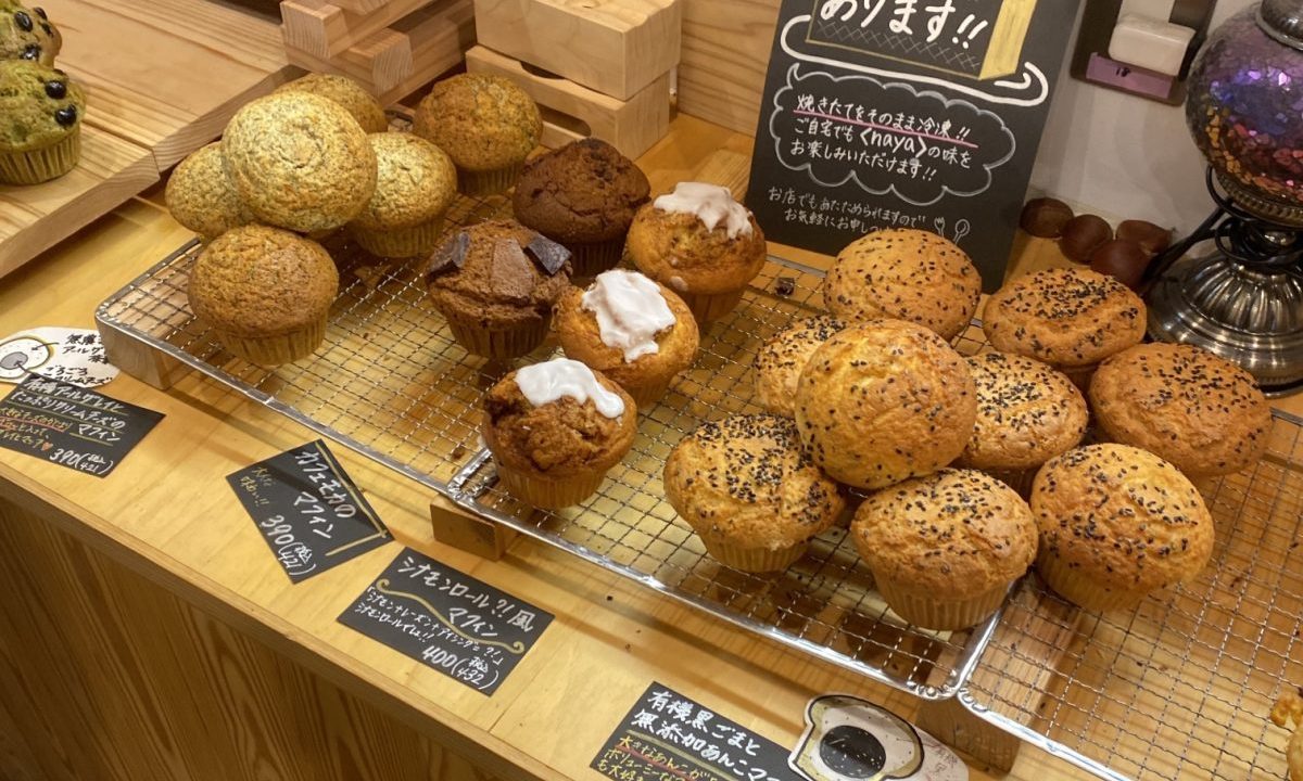 nayaはマフィンやクッキーなどの焼き菓子、カフェメニューなどを販売しているお店です。施設内にはテーブル、いすがあるのでゆったりとカフェメニューを食べることもできるし持ち帰りもできます!