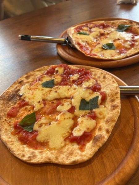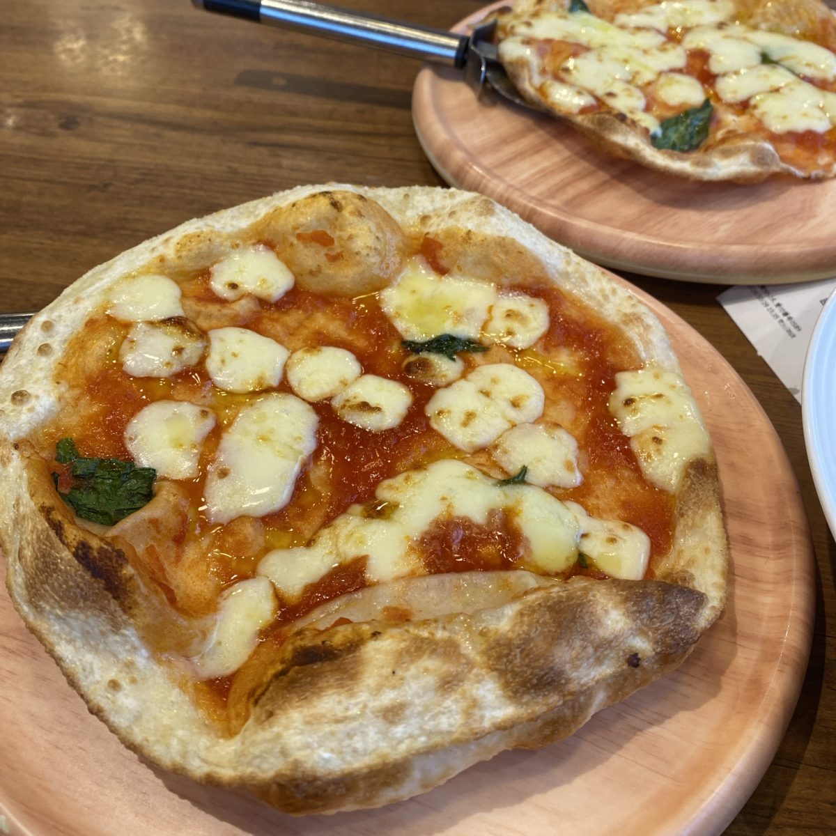 ピザは、薄い生地のマルゲリータです。薄くて食べやすいからぺろっと食べれます。