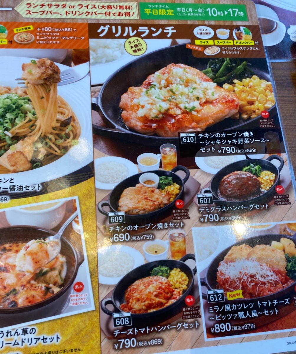 | グリルランチセット | ライス(orブルスケッタ)、スープバー、ドリンクバー |