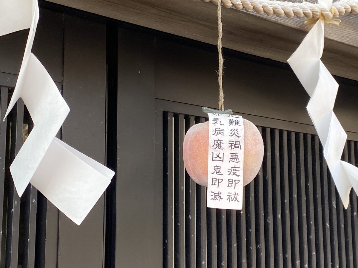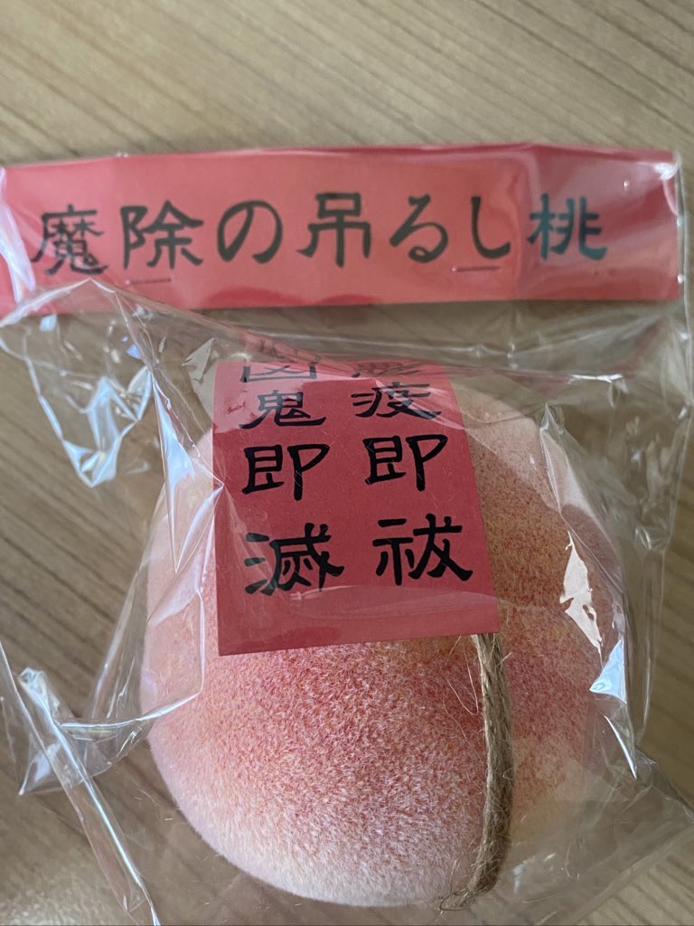 もとは節分の追儺祭において境内に打ち撒かれたつくり桃が起源です。玄関などに吊るして、外からの邪気を除けるとされてきました。吊るすほか、床の間に飾ったり、机の上に置くことで魔除けとします。