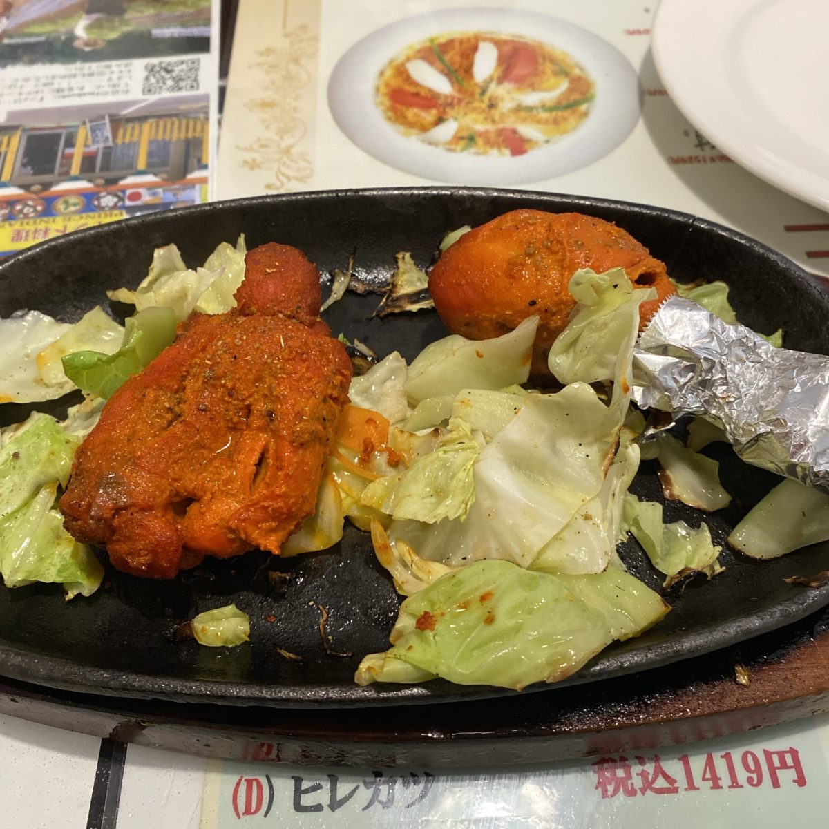 鉄板で焼いたあるタンドリーチキン初めて食べたけど美味しかった~!柔らかくって、味がなかまでしみてて。タンドリーと一緒にキャベツもいためると、キャベツもスパイシーになって美味しい食べ方でした~~!
