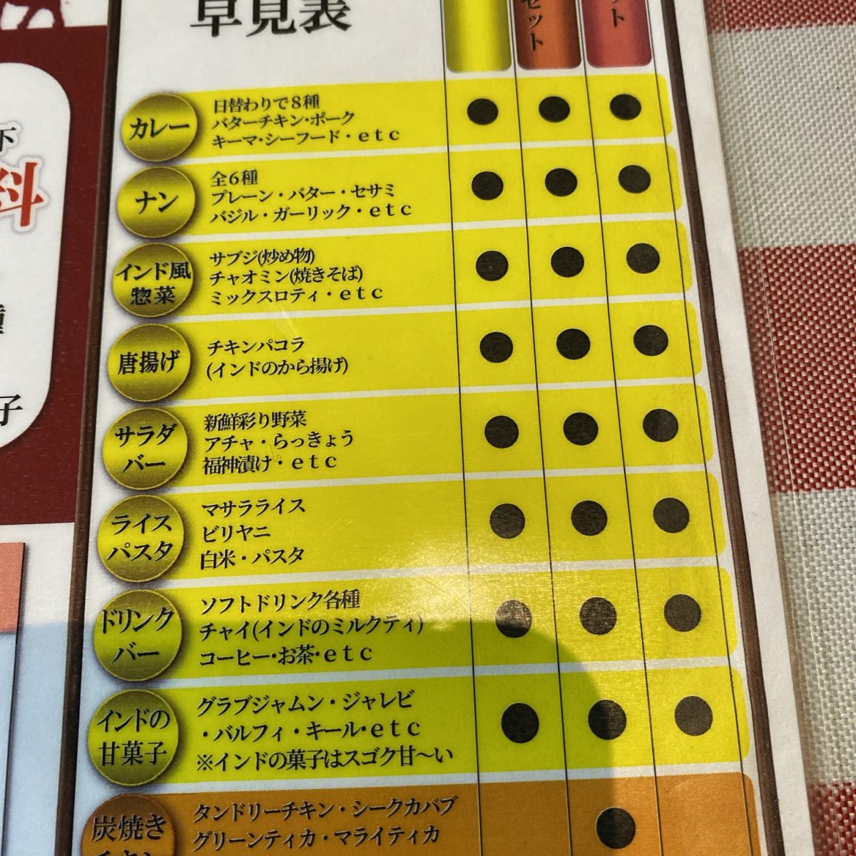 ナン、カレー、唐揚げの他にもお米系、各種サラダ、謎のインドデザート、パリパリ煎餅みたいなやつパーパド?、ドリンクもそろっていました。