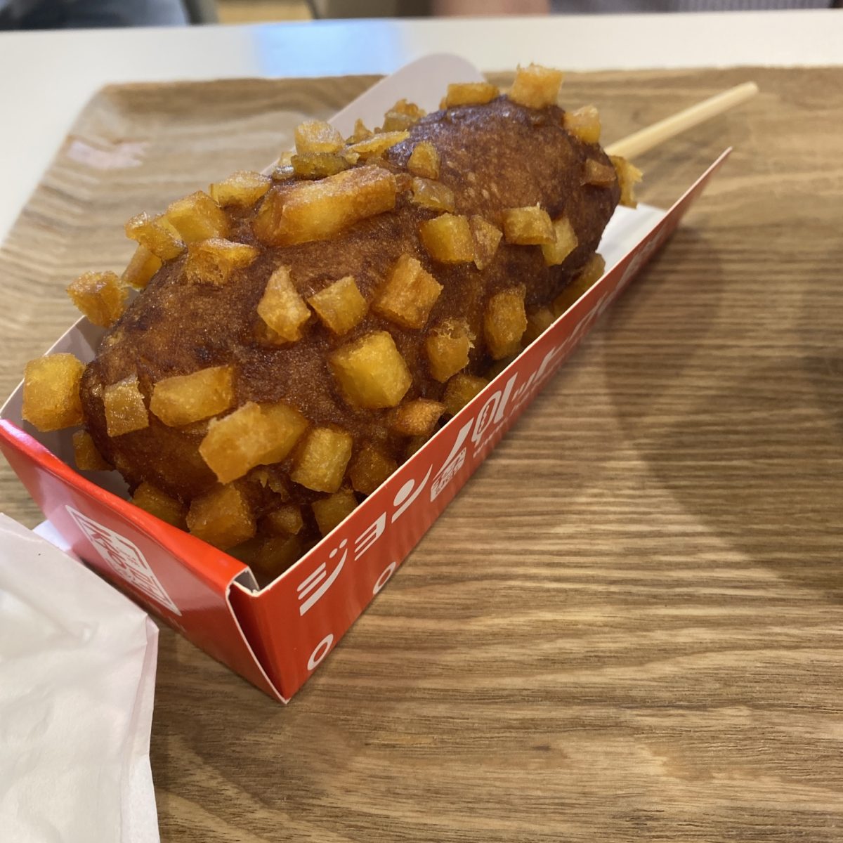 私ハットグって食べたことないんですが、この衣についたドドリアさんの皮膚みたいなぶつぶつ、これポテトなんですね