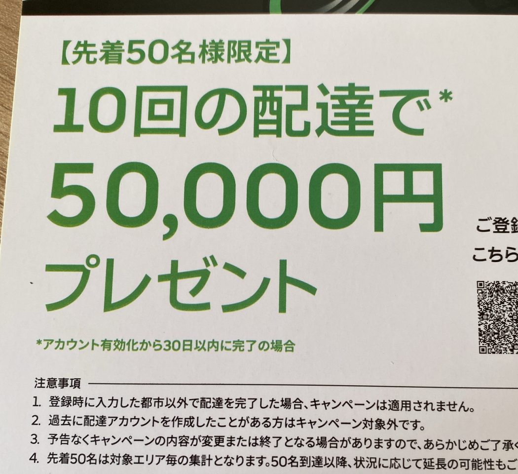 10回の配達で5万円プレゼントという大盤振る舞いキャンペーンあるようです。