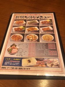 | ぎょうざ | 焼き餃子、わさび餃子、大葉餃子、揚げ餃子、鉄板焼き餃子 |