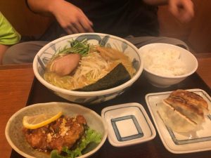 ゆきむら亭の欲張りセットは好きなラーメンにライス、餃子、若鶏中華ソースがついてくるお得なセットです。